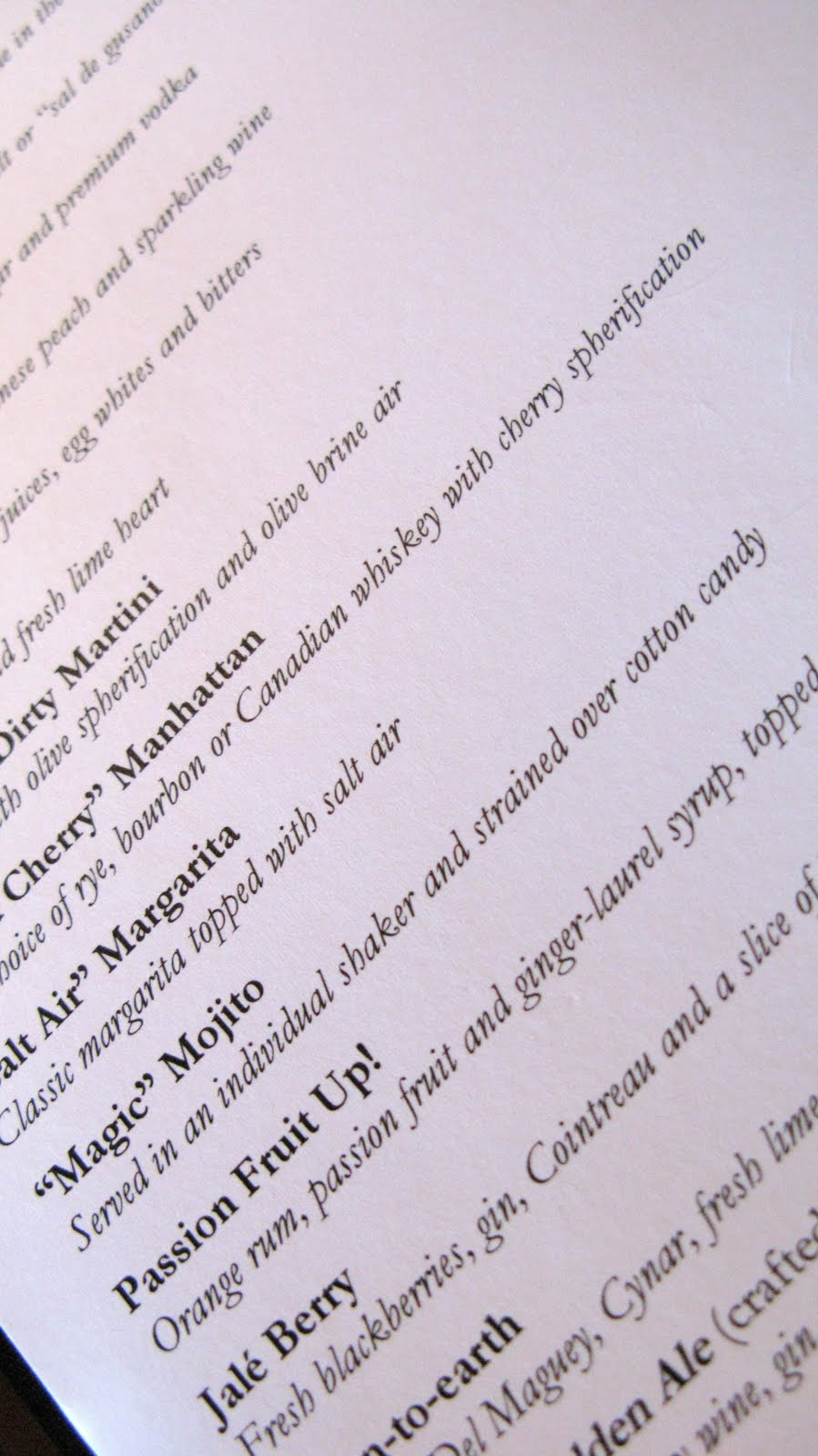 I was initially disappointed with our reservation time and place for The Bazaar. I called only a week before we arrived, so the best we could do was 6:15PM on the Terrace. The hostess warned me on the phone that while the Terrace was heated, it faced the valet and they allowed smoking. Eating at The Bazaar was the part of our trip I was probably looking forward to most (aside from seeing old friends), so I was worried that we weren't going to have the true Bazaar experience. When we checked into the hotel, though, I asked the guy giving us a tour of our room (yes, there was a tour) if he could do anything about the reservation. After telling us that he could not, he reassured us that we were better off early because the service would be more personal and that he preferred the Terrace. I know he's paid to make us feel better, but it worked.
