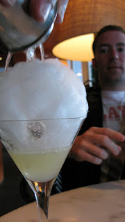 As it turns out, earlier was better. Beginning to end, dinner took just over 3 hours. We had two servers. One who seemed to be the drink guy, one who was the food guy. Both were friendly. Our table turned out to be just fine. The heaters were close enough and it was warm enough outside that the temperature was comfortable and we had a view of every exotic, absurdly expensive luxury car that drove into the valet. B enjoyed this part a bit more than I did. We both started our meal with the "Magic" Mojito because multiple people said we had to. When we ordered, we told Drink Server that it came highly recommended. He replied, "You'll see." And did we ever. Here are the before, during and after shots of the "Magic" Mojito.