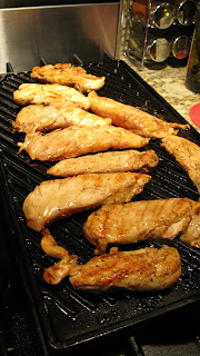 Instead, tonight I broke out the stovetop grill again. I think the gray outside is getting to me, but I just have no energy at all. Add my chronic insomnia to the mix and I'm left pretty zapped. I'd planned to attempt shrimp Po' Boys tonight, but those will have to wait for another day when I'm feeling a little more up for it. I pretty much made a variation of the skewers from a couple weeks ago... minus the skewers.