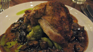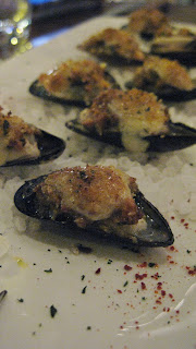 We ducked in out of the torrential downpour, were invited to hang up our coats and hats, were seated promptly and greeted soon after by our very friendly server. Their website toutes a European style, but the environment was distinctly more French than anything. From the small bistro tables to the ornate light fixtures and the blackboard displaying the night's specials, it had a bit of Parisian flair. After ordering our drinks and the special baked mussels to start, we settled in with the small menu.