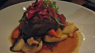 B and I both had the Painted Hills Tenderloin with wild mushrooms, patatas bravas, braised greens, foie gras torchon and demi-glace. I normally don't photograph other people's food, but since D's Sumac braised Lamb shank with grilled sweet onions, eggplant za'atar (I have no bloody idea what za'atar is, incidentally), grilled lemons, lebne and and cucumber looked so good (and because he offered), I took a photo.
