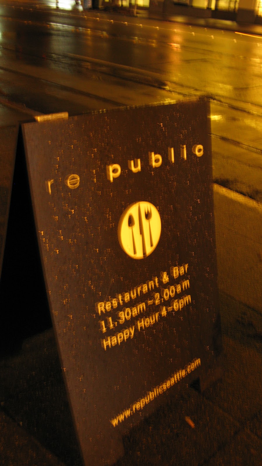 Re:Public itself has a very understated entrance. There isn't a large sign above the door. Instead there is only the name etched in the glass on the door and the sandwich board sign on the sidewalk. How very Seattle. I first noticed the massive glass garage door just to the right of the main entrance a couple of months ago (during warmer days) when it was open and one could see the diners enjoying their meal open air. Amidst tonight's typical cold and rain, though, the door was closed tight. I dream of the next few month passing quickly, returning us contentedly to our long, late daylight patio happy hours of specialty cocktails and small bites.
