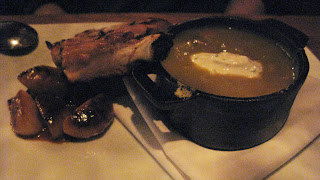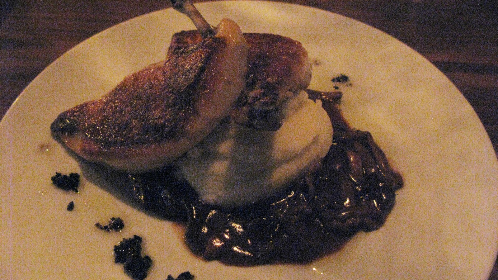 We eventually got our servers attention to ask if we could order entrees. I selected the half Mad Hatcher chicken with shaved local truffles and potato puree. B had the grilled pork chop with split pea and smoked pork shank soup with cipollinis.