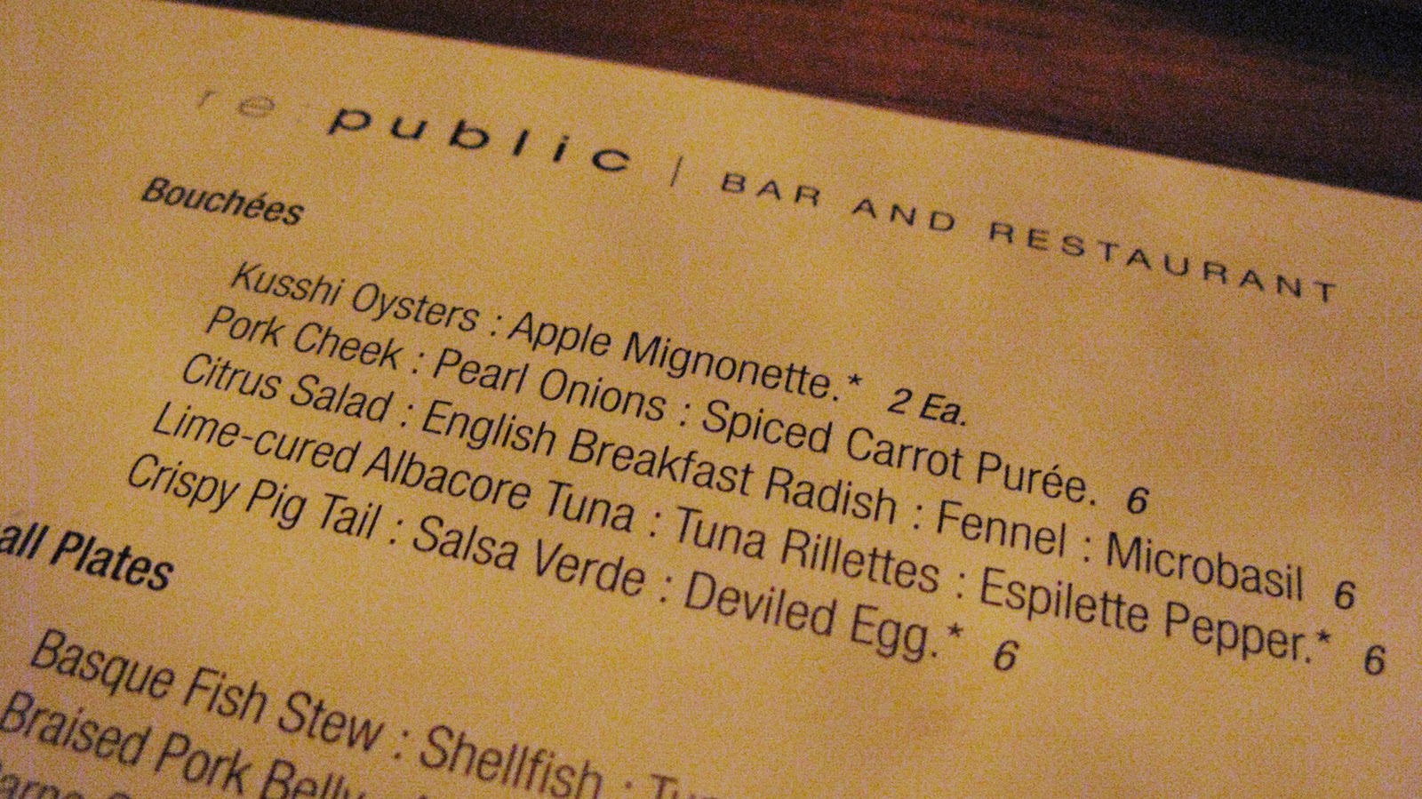 The menu is broken up into slightly different sections than what you see traditionally. They have categories for Bouchees, Small Plates, House-Made Pasta, Principals and Dessert. B and I had both looked at the menu earlier, so we had a good idea what we wanted.