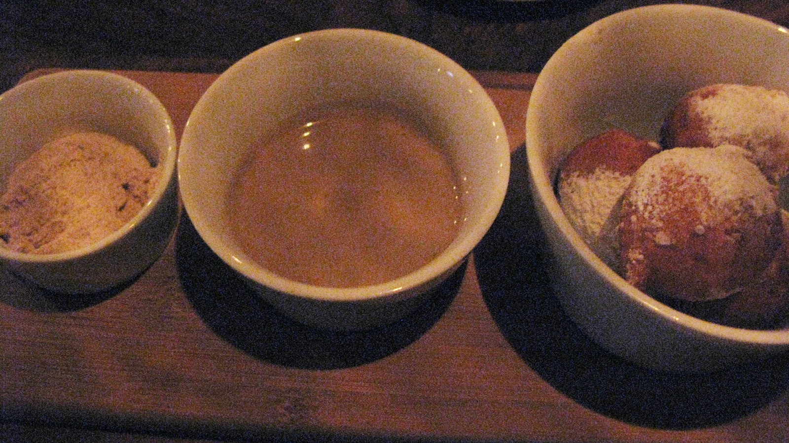After we finished dinner and again managed to get the attention of our server for B to order another drink, we seized the opportunity before she could escape again and ordered Coffee and Donuts (fritters dusted with powdered sugar with espresso creme anglaise and ricotta for dipping. These were, without a doubt, the highlight of the meal. They were incredible! B went so far as to say they were better than the beignets at Dahlia. I'm not sure I'm ready to go that far, but I could have eaten a whole order all on my own.